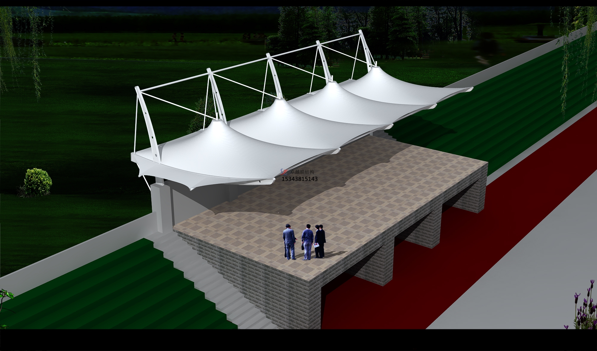 膜結構遮陽棚作為室外膜結構建筑,自然需要考慮在各種氣候條件下荷載及受力情況。由于膜材是柔性的新型建筑材料,具有一定的伸縮性 ,膜面在荷載的作用下會有一定的變形 ,所以景觀膜結構建筑對“雨”和"雪” 是比較敏感的。膜結構的建筑設計和結構設計階段都必須充分考慮“排水”和“排雪”問題。否則,會留下很大的隱患。以往很多景觀膜結構的工程事故中,這個問題是導致事故的主要原因之一 。