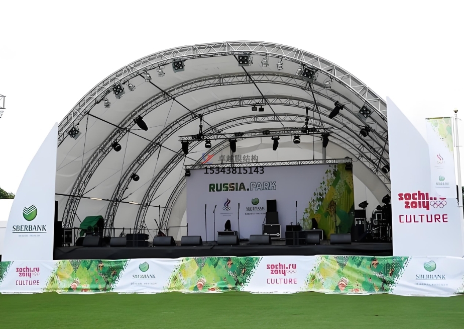 在野外展覽、商業(yè)促銷活動、主題派對等場合,舞臺膜結(jié)構(gòu)也得到了廣泛運用。它可以作為扮演舞臺、展現(xiàn)平臺或活動場所的遮陽設(shè)備。例如,在一些汽車品牌的野外展現(xiàn)活動中,膜結(jié)構(gòu)舞臺被規(guī)劃成與汽車品牌形象相符合的造型,既為新車展現(xiàn)供給了一個共同的平臺,又能招引觀眾的注意力,提高品牌宣傳作用。在野外音樂節(jié)、美食節(jié)等活動中,膜結(jié)構(gòu)舞臺為扮演樂隊、扮演團隊供給了扮演空間,一起其共同的造型也成為活動現(xiàn)場的一道亮麗風(fēng)景線,增加了活動的招引力和趣味性。