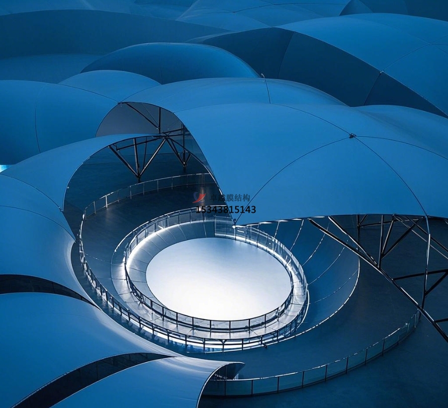形狀多樣性:膜結(jié)構(gòu)憑借其柔性資料的特性,可以完成自由空間曲面的規(guī)劃,造型豐厚多樣。從簡練流通的單曲面到復(fù)雜多變的多曲面,從高雅的弧形到賦有張力的異形,膜結(jié)構(gòu)舞臺可以依據(jù)扮演主題、場所環(huán)境以及規(guī)劃師的創(chuàng)意,塑造出千變?nèi)f化的形狀。如在一場以 “天然之舞” 為主題的舞蹈扮演中,舞臺膜結(jié)構(gòu)規(guī)劃成了一片隨風(fēng)飄動的樹葉形狀,膜材的輕柔質(zhì)感與樹葉的靈動形狀完美結(jié)合,為舞蹈藝人們打造了一個充溢天然氣味的扮演空間,讓觀眾似乎置身于森林之中,增強了扮演的沉溺感與藝術(shù)感染力。