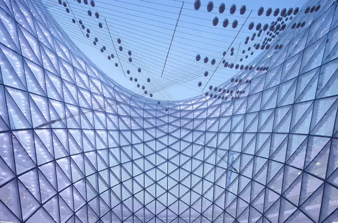 索膜結(jié)構(gòu)建筑是一種以高強(qiáng)度柔性薄膜材料(膜材)與張力支撐系統(tǒng)(鋼索、桅桿、框架等)結(jié)合形成的空間結(jié)構(gòu)體系,兼具藝術(shù)性與技術(shù)性。其建筑組成是用高強(qiáng)度柔性薄膜材料經(jīng)受其它材料的拉壓作用而形成的穩(wěn)定曲面,基本組成單元通常有膜材、索與支承結(jié)構(gòu)。通過(guò)張拉索和膜材相互作用形成預(yù)應(yīng)力狀態(tài),使結(jié)構(gòu)具有輕質(zhì)、高強(qiáng)度的特點(diǎn),能承受一定外荷載。其核心特點(diǎn)是利用預(yù)張應(yīng)力塑造穩(wěn)定曲面,實(shí)現(xiàn)傳統(tǒng)建筑難以企及的大跨度無(wú)柱空間。