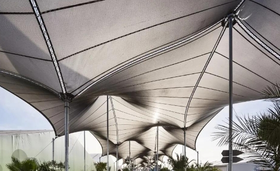 索膜結(jié)構(gòu)建筑的優(yōu)勢(shì)特點(diǎn):其優(yōu)勢(shì)特點(diǎn)有大跨度無(wú)柱空間、輕質(zhì)節(jié)能、快速施工、藝術(shù)表現(xiàn)力、造型自由、節(jié)能環(huán)保、抗風(fēng)抗震強(qiáng)、透光性好、維護(hù)成本低等。大跨度無(wú)柱空間表現(xiàn)在其能突破傳統(tǒng)結(jié)構(gòu)限制,覆蓋面積可達(dá)數(shù)萬(wàn)平方米(如青島頤中體育場(chǎng)3萬(wàn)㎡屋面)。輕質(zhì)節(jié)能表現(xiàn)在其自重僅為傳統(tǒng)建筑的1/30,減少基礎(chǔ)造價(jià);透光膜材降低日間照明能耗??焖偈┕?zwnj;主要指工廠預(yù)制膜片與索構(gòu)件,現(xiàn)場(chǎng)組裝效率高,工期可比傳統(tǒng)建筑縮短75%。藝術(shù)表現(xiàn)力是指曲面造型自由靈動(dòng),如大阪世博會(huì)盧森堡館以莫比烏斯帶為靈感的膜結(jié)構(gòu),兼具投影載體功能。造型自由,能根據(jù)設(shè)計(jì)師的靈感,實(shí)現(xiàn)各種曲面、弧形等獨(dú)特造型,讓建筑物更具藝術(shù)性。節(jié)能環(huán)保,使用材料較少,制造過(guò)程能耗低,膜材透光性好,可大幅減少白天人工照明需求。施工快速,材料輕便,通常通過(guò)預(yù)制組件進(jìn)行安裝,施工周期短,能節(jié)省人工和時(shí)間成本。抗風(fēng)抗震強(qiáng),輕質(zhì)和柔性特點(diǎn)使其在面對(duì)風(fēng)力或地震時(shí)能分散外力,減少直接沖擊,提升安全性。透光性好,膜材的透光性可為建筑提供所需照度,創(chuàng)造出自然漫射光的室內(nèi)空間視覺(jué)環(huán)境,夜晚還可成為光的雕塑。維護(hù)成本低,一些膜材如 PTFE 膜材抗老化性能好,壽命長(zhǎng),且膜面光滑,灰塵等不易附著,經(jīng)雨水沖刷可恢復(fù)清潔。