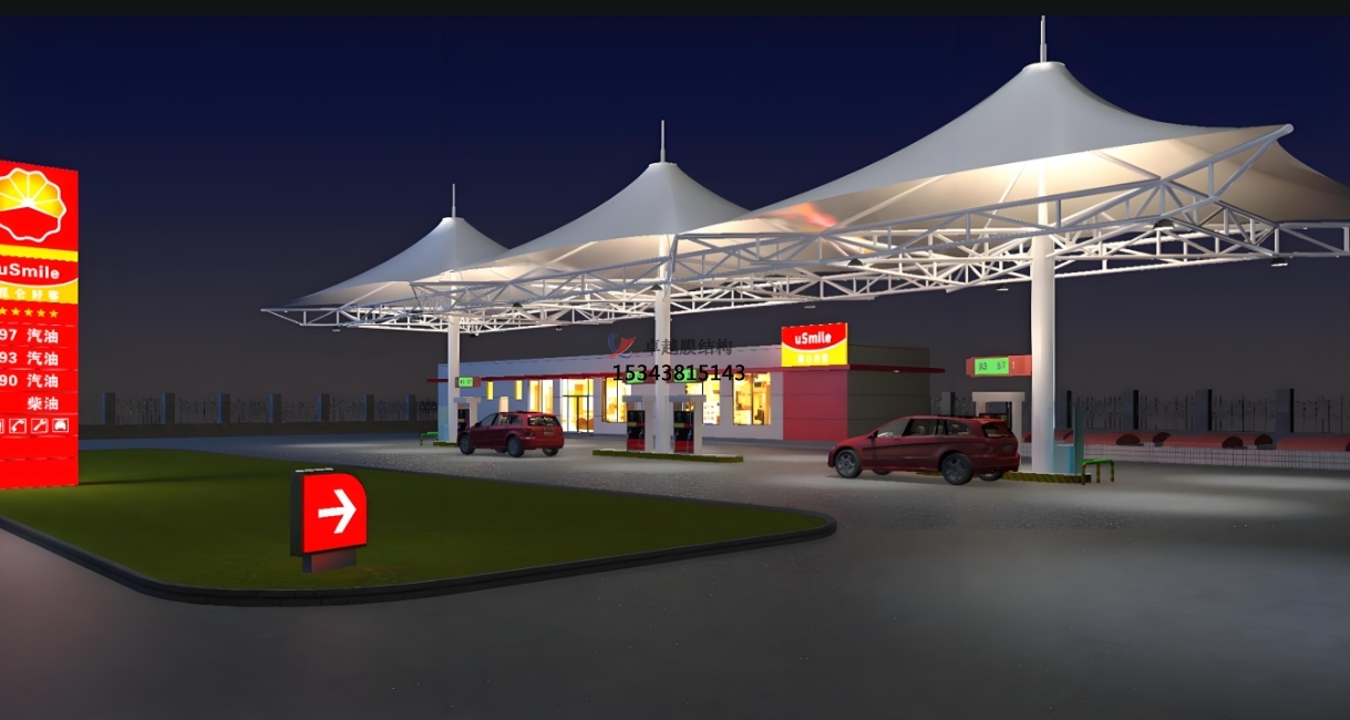 加油站膜結(jié)構(gòu)頂棚在實際應(yīng)用中已經(jīng)取得了顯著的效果。許多新建的加油站都采用了這種頂棚形式,不僅提升了加油站的整體形象,還為顧客提供了更加舒適的加油環(huán)境。同時,膜結(jié)構(gòu)頂棚的輕質(zhì)高強特點也使得加油站的建設(shè)成本得到了一定程度的降低。
