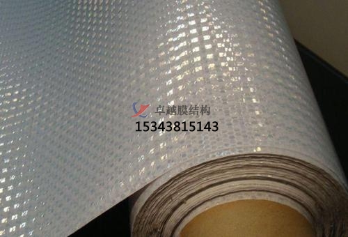 膜結構車棚上面的膜材是一一種刀刮布,是一種化學合成材料,厚度比普通的布要厚。刀刮布的正面是光滑的,背面是粗糙的,顆粒狀比較厚分布布均勻。