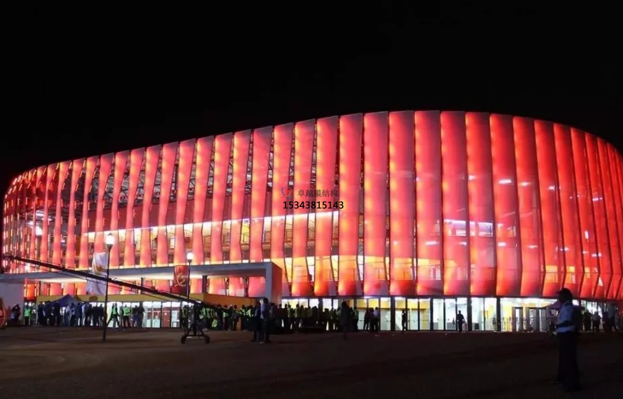 膜材是在聚酯纖維編織成的基布上涂敷PVC(聚氯乙烯)樹脂而形成的復(fù)合材料,非常的具有技術(shù)含量,其曲面可以隨著建筑師的設(shè)計(jì)需要任意變化,結(jié)合整體環(huán)境,建造出標(biāo)志性的形象工程。
