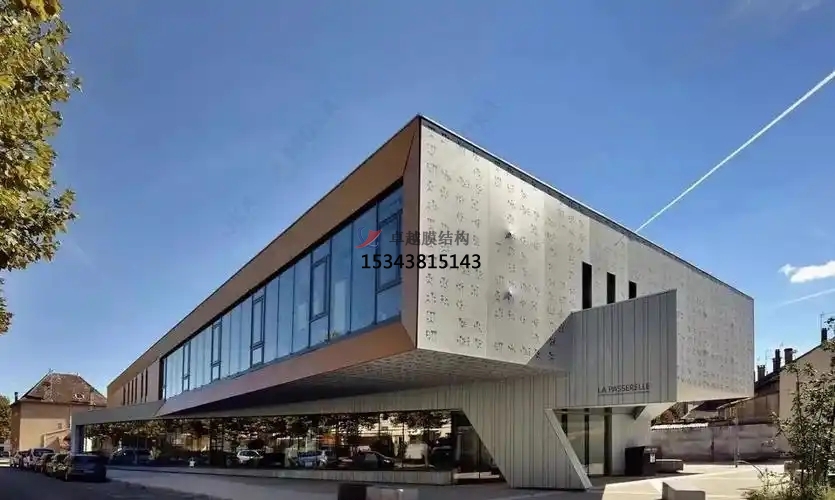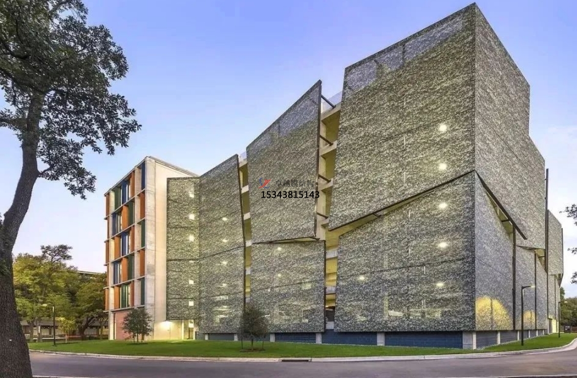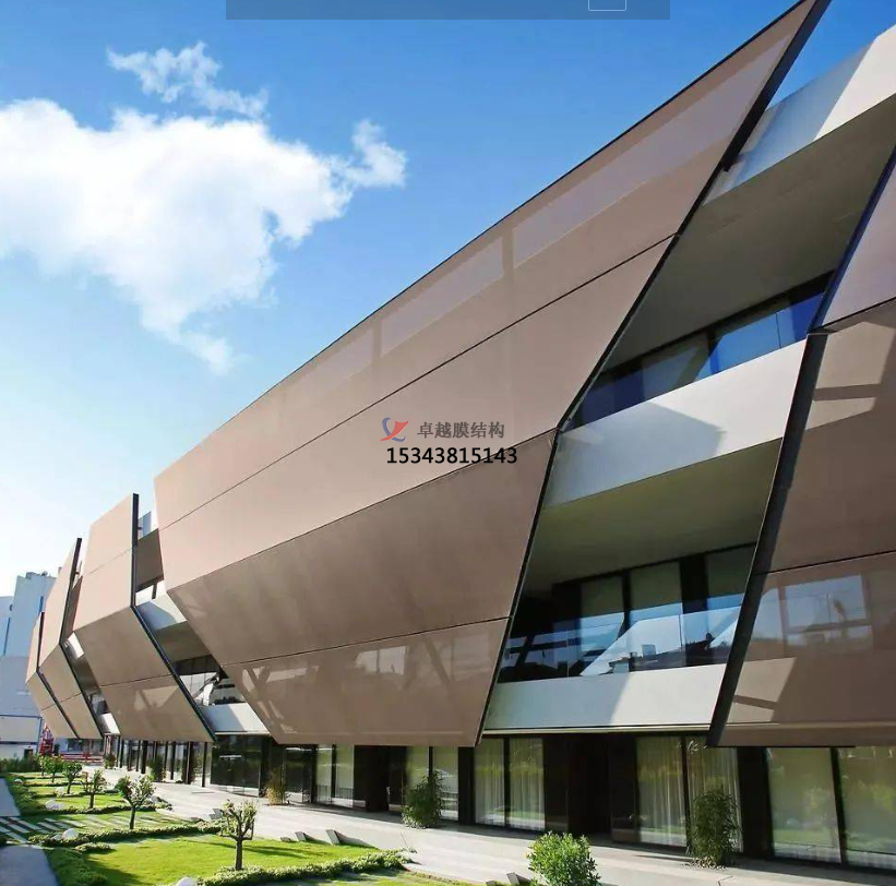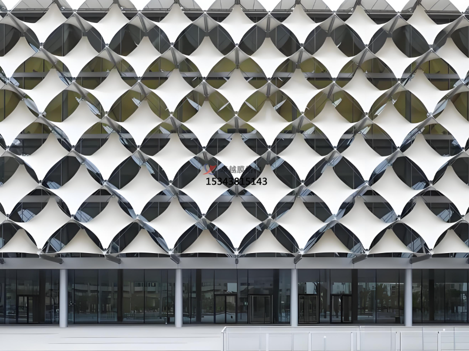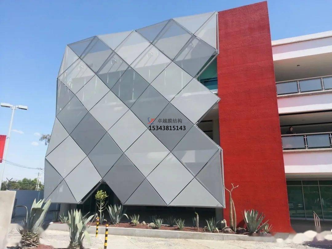 膜材作為建筑外立面的應(yīng)用工程,是采用拉索支撐、專用鋁型材張拉幕材的工程。