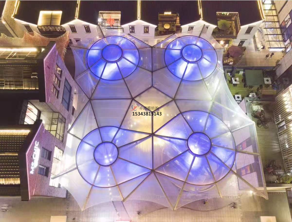 3、PVC、PVDF膜材料特點(diǎn)說明:PVC膜材料的織物基材應(yīng)為聚酯類、聚酰胺類的纖維織物。涂層主要為聚氯乙烯類(PVC)樹脂,依據(jù)功能要求不同涂層的重量應(yīng)在400~1500g/m2之間,面層宜選用聚偏氟乙烯樹脂(PVF)、聚二氟乙烯樹脂(PVDF)、聚丙烯樹脂(ACRYLIC)、硅樹脂等,且應(yīng)具有改進(jìn)PVC膜材料的自潔性及抗老化性能的功能。PVC膜材料的厚度應(yīng)大于0.5mm。面層在保質(zhì)期內(nèi)應(yīng)具有穩(wěn)定的抗腐蝕、抗紫外線的侵蝕能力,具有自潔性能。