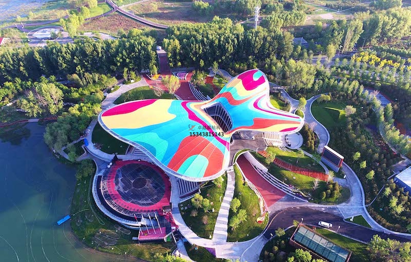 ETFE膜材除了常規(guī)的透明、藍(lán)色、白色、銀色鍍點(diǎn)外,其實(shí)還有五顏六色的彩色系列。今天就給大家介紹一個(gè)ETFE彩色膜應(yīng)用的經(jīng)典案例:2019的北京世園會(huì)的主場館——媯汭劇場,外觀為彩色蝴蝶造型。