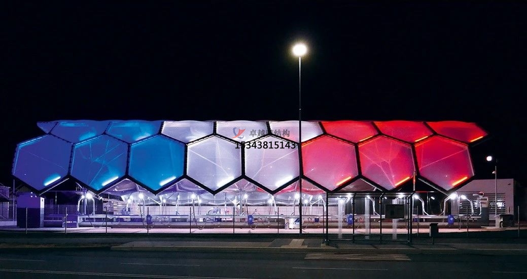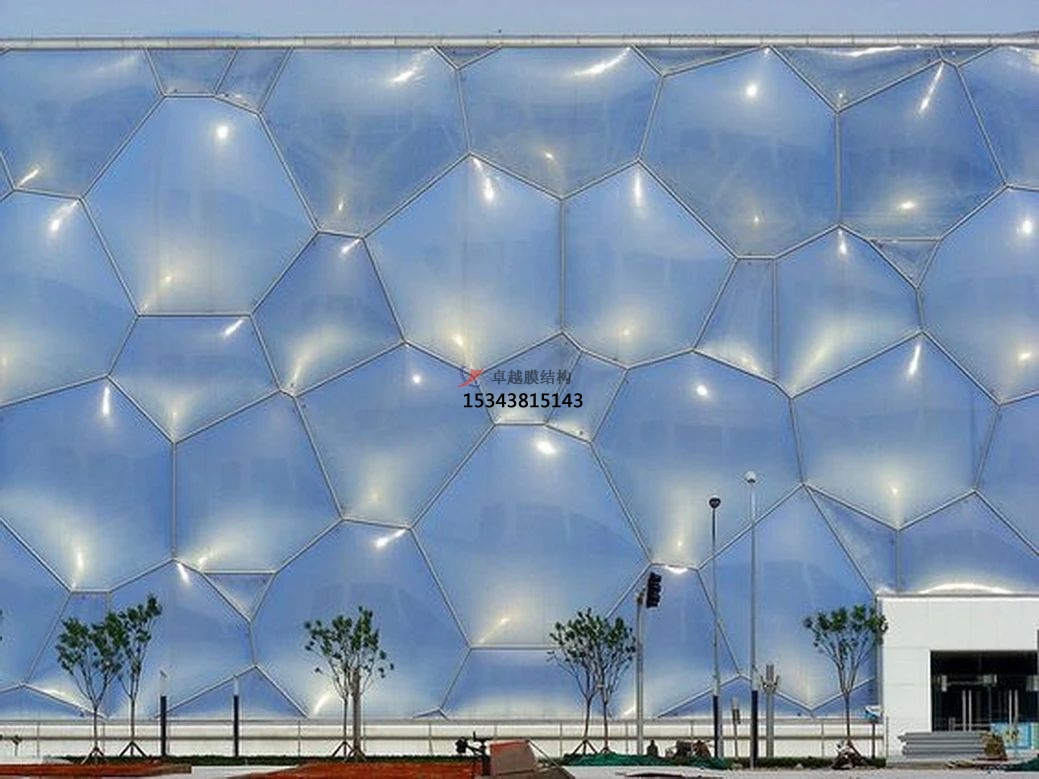 張拉膜結(jié)構(gòu)可以根據(jù)需要制成任意復(fù)雜曲面形狀,體現(xiàn)自然流暢之美;并有多種顏色的膜材可選,以適應(yīng)周邊的環(huán)境、滿足建筑效果要求;而且膜結(jié)構(gòu)質(zhì)量輕,一般不需要太龐大的支撐結(jié)構(gòu),這是其他建筑材料無(wú)法比擬的優(yōu)勢(shì)所在。
