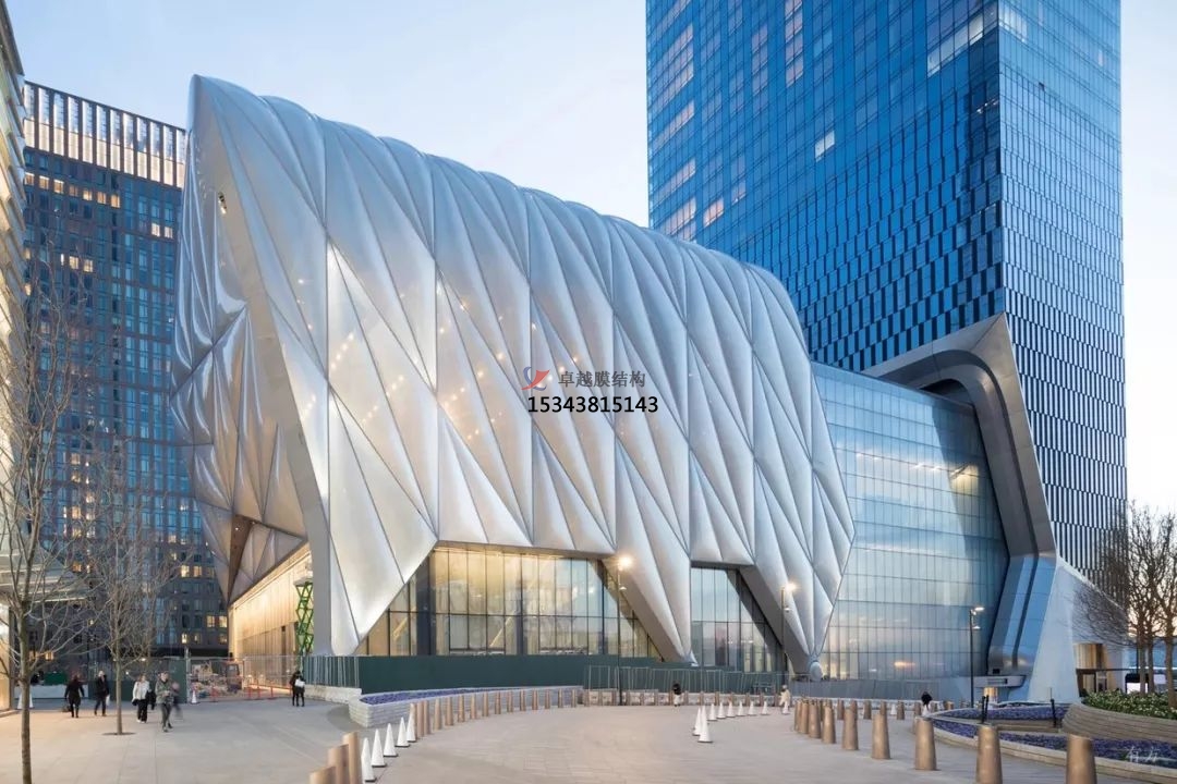在哈德遜碼頭上,全新的跨界“棚屋”藝術(shù)中心(The Shed)于2019年4月5日對(duì)外開(kāi)放。藝術(shù)中心由著名建筑公司 Diller Scofidio+Renfro 和 Rockwell 集團(tuán)合作設(shè)計(jì),打造了覆蓋著ETFE氣枕膜材料的120英尺的伸縮式外殼,能夠通過(guò)滾輪將建筑延伸至“棚屋”的戶外廣場(chǎng),營(yíng)造更開(kāi)闊的半戶外空間,旨在創(chuàng)建世界上最具靈活性的文化機(jī)構(gòu)。