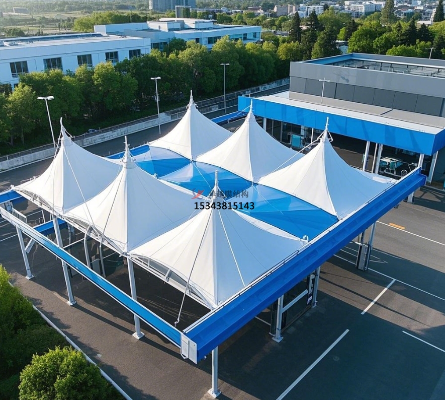 后期維護(hù)成本:膜結(jié)構(gòu)雨棚維護(hù)成本極低。膜材自潔性能使雨棚表面不易積垢,一般每年僅需 1 - 2 次簡(jiǎn)單清潔檢查即可保持外觀整潔。同時(shí),膜材與支撐結(jié)構(gòu)耐久性好,正常使用下很少損壞,降低維修成本。反觀傳統(tǒng)結(jié)構(gòu)雨棚,需定期進(jìn)行油漆保養(yǎng)、結(jié)構(gòu)檢測(cè)等維護(hù)工作,成本較高。例如,某傳統(tǒng)鋼結(jié)構(gòu)加氣站雨棚每年維護(hù)費(fèi)用高達(dá)數(shù)萬(wàn)元,而采用膜結(jié)構(gòu)的同類型雨棚,年維護(hù)成本僅幾千元。