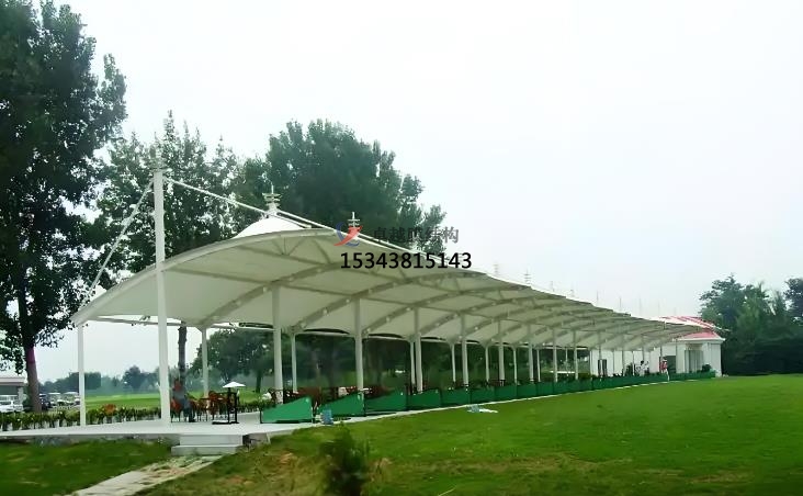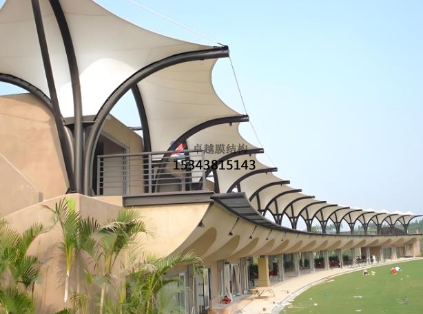 應(yīng)用場景:發(fā)球臺罩棚,看臺與觀賽區(qū),停車棚與配套設(shè)施,景觀與休閑區(qū)。發(fā)球臺罩棚為球員提供遮陽、避雨的空間,造型靈活美觀,與球場自然環(huán)境融合??磁_與觀賽區(qū)大跨度膜結(jié)構(gòu)看臺可覆蓋大量觀眾,輕量化設(shè)計降低基礎(chǔ)成本,同時具備通透視野。停車棚與配套設(shè)施則保護車輛免受紫外線、雨水侵蝕,常見于高爾夫球場入口或停車場。景觀與休閑區(qū)膜結(jié)構(gòu)為小品、廊道等提升球場景觀性,營造現(xiàn)代感。
