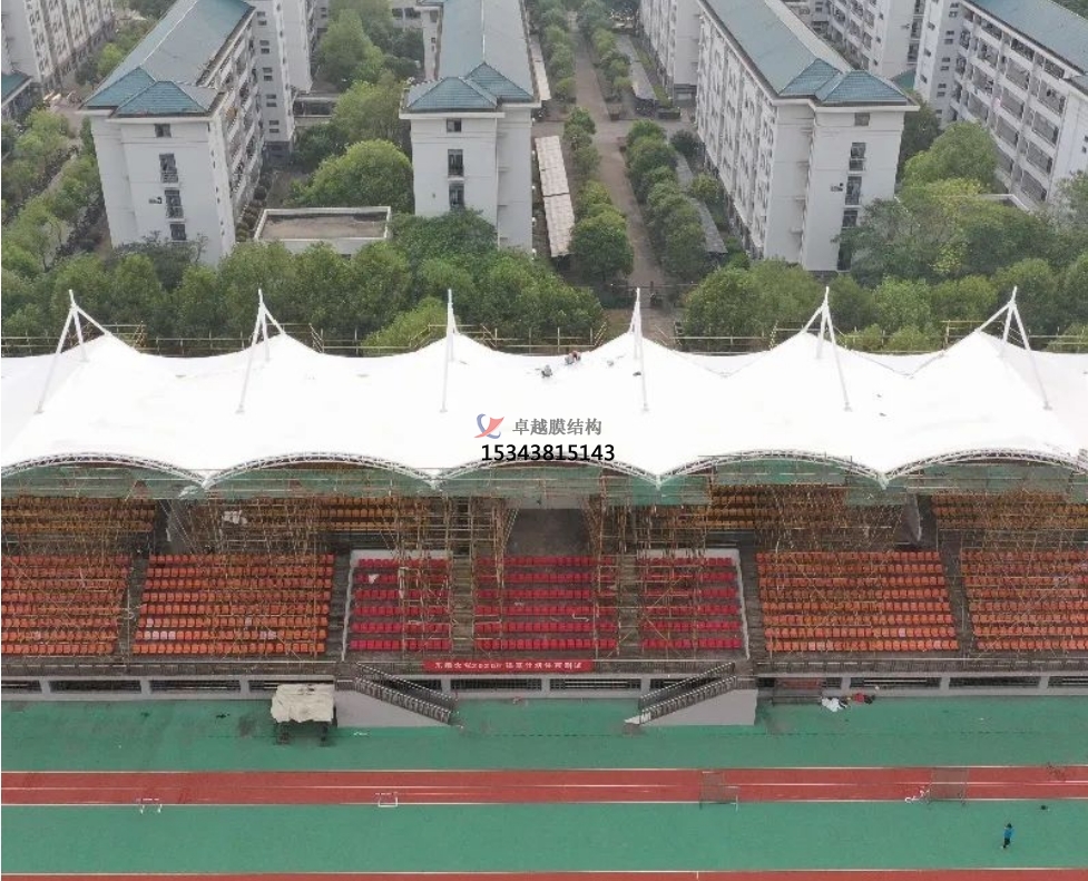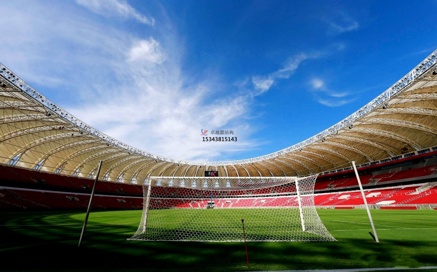 膜結(jié)構(gòu)體育看臺是以高強(qiáng)度柔性薄膜材料(如ETFE、PTFE、PVDF等)為覆蓋層,通過鋼索、鋼結(jié)構(gòu)框架或張力系統(tǒng)形成預(yù)張應(yīng)力空間結(jié)構(gòu)的建筑形式24。其設(shè)計(jì)融合建筑力學(xué)與材料科技,既能實(shí)現(xiàn)大跨度無柱懸挑,又能塑造流線型外觀,滿足體育場館寬視野、低荷載的建造需求。