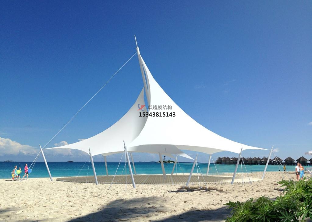 先將地面位置上的雜物和油漬清理干凈, 將突出地面的帶有銳角的硬物剔除;然后將已經(jīng)清洗干凈的保護(hù)膜鋪設(shè)在地面上并拉設(shè)好防護(hù)繩;接著將膜結(jié)構(gòu)景觀工程中需要安裝的膜單元從堆放場運(yùn)至安裝位置;拆除包裝, 將膜單元展開, 檢查膜單元周邊尺寸, 搭接長度、開孔位置、熱合縫是否符合要求, 檢查膜而是否有破損, 是否有瑕疵, 是否有污染, 合格后進(jìn)入下道工序;末后檢查清理膜單元及鋼結(jié)構(gòu)的觸面, 把殘存的飛濺尖角、物料清理掉并且進(jìn)行打磨光滑。