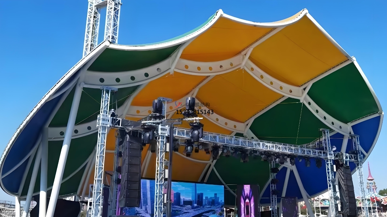 在設計膜結(jié)構舞臺時,首要任務是深入理解演出主題與風格。從色彩、造型到整體氛圍營造,都應圍繞主題展開。若是一場古典音樂會,膜結(jié)構舞臺可采用簡潔、優(yōu)雅的白色調(diào),搭配流暢的線條,營造出莊重、典雅的氛圍;而對于現(xiàn)代藝術展的舞臺,則可以運用大膽的色彩和前衛(wèi)的造型,展現(xiàn)出創(chuàng)新與活力。通過精準的設計,膜結(jié)構舞臺成為演出主題的視覺延伸,強化藝術表達。