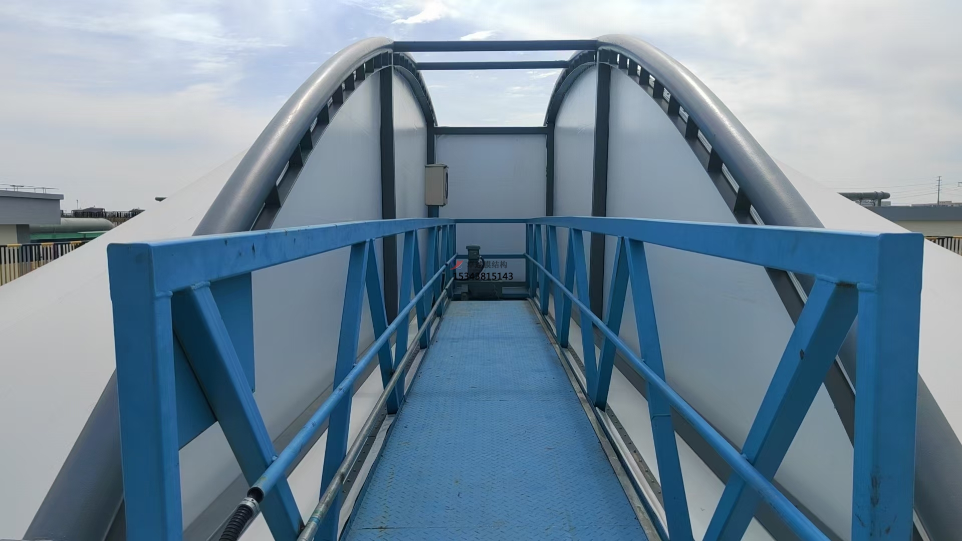 加蓋的方式有兩種,一種是加高蓋,一種是加低蓋。加高蓋的具體做法是在需加蓋的構筑物上加一個高度約1~5m的大蓋,將所有的池面、設備均罩在里面(走道板外挑可以不罩在里面);加低蓋的具體做法是在構筑物水面上加一個高度不超過2m的蓋,將所有的走道、設備均露在蓋外,僅將污水水面罩住。