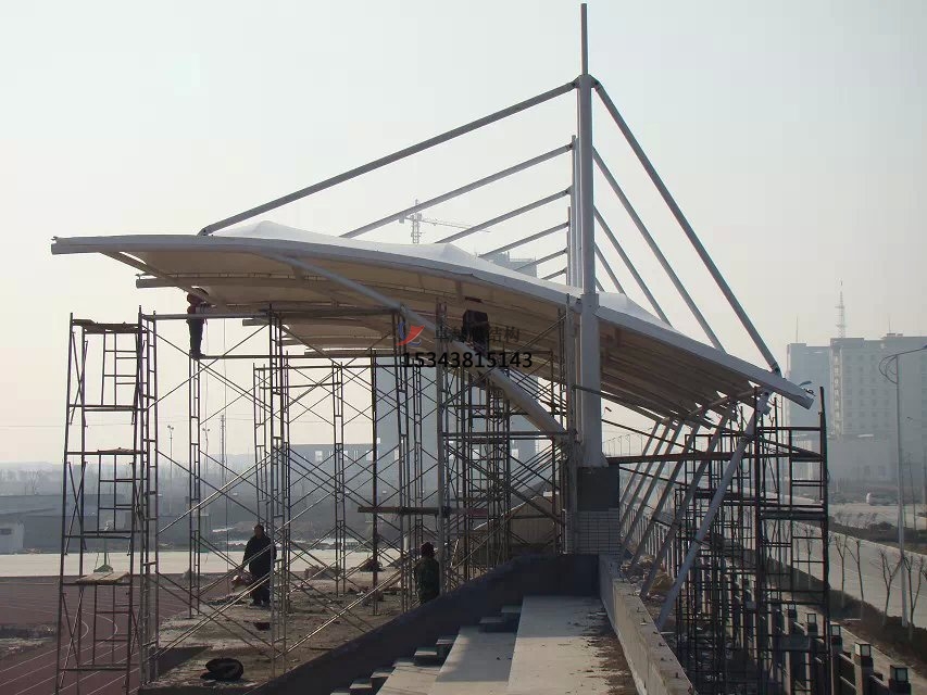 張拉膜看臺主要用于各類地方體育場主席臺雨棚,各類學(xué)校體育場看臺雨棚遮蓋,我公司是國內(nèi)較早從事大懸挑張拉膜結(jié)構(gòu)看臺設(shè)計施工的專業(yè)廠家,下面介紹一下我們在隨州周邊縣市完工的一些張拉膜看臺設(shè)計施工案例,我公司先后在恩施周邊承接了隨州職業(yè)技術(shù)學(xué)院看臺雨棚、湖北省孝感高級中學(xué)看臺罩棚、神農(nóng)架林區(qū)幼兒園張拉膜看臺遮陽棚張拉膜看臺遮陽棚等設(shè)計施工項目,簡介如下: