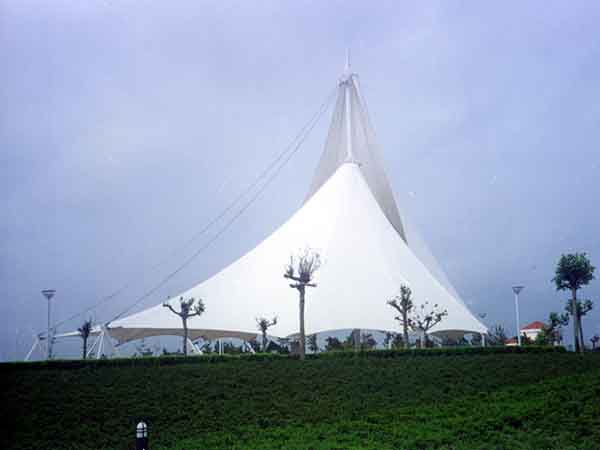 2、景觀膜結構是目前發(fā)展很快的一種新型空間結構,是一種效率極高的張力集成體系,可以充分發(fā)揮鋼索的強度與張拉整體結構的空間作用。它通過鋼骨架、鋼索與膜材共同受力形式穩(wěn)定曲面來覆蓋建筑空間,具有高度的形體可塑性和結構靈活性,即通過對膜材內部施加一定的預張力,使其具備了抵抗外荷載能力,從而充當結構材料的一種結構體系。我公司先后在寧波地區(qū)承接了寧波新世界廣場景觀、寧波時代廣場景觀、寧波工業(yè)園區(qū)景觀小品的設計施工,簡介如下: