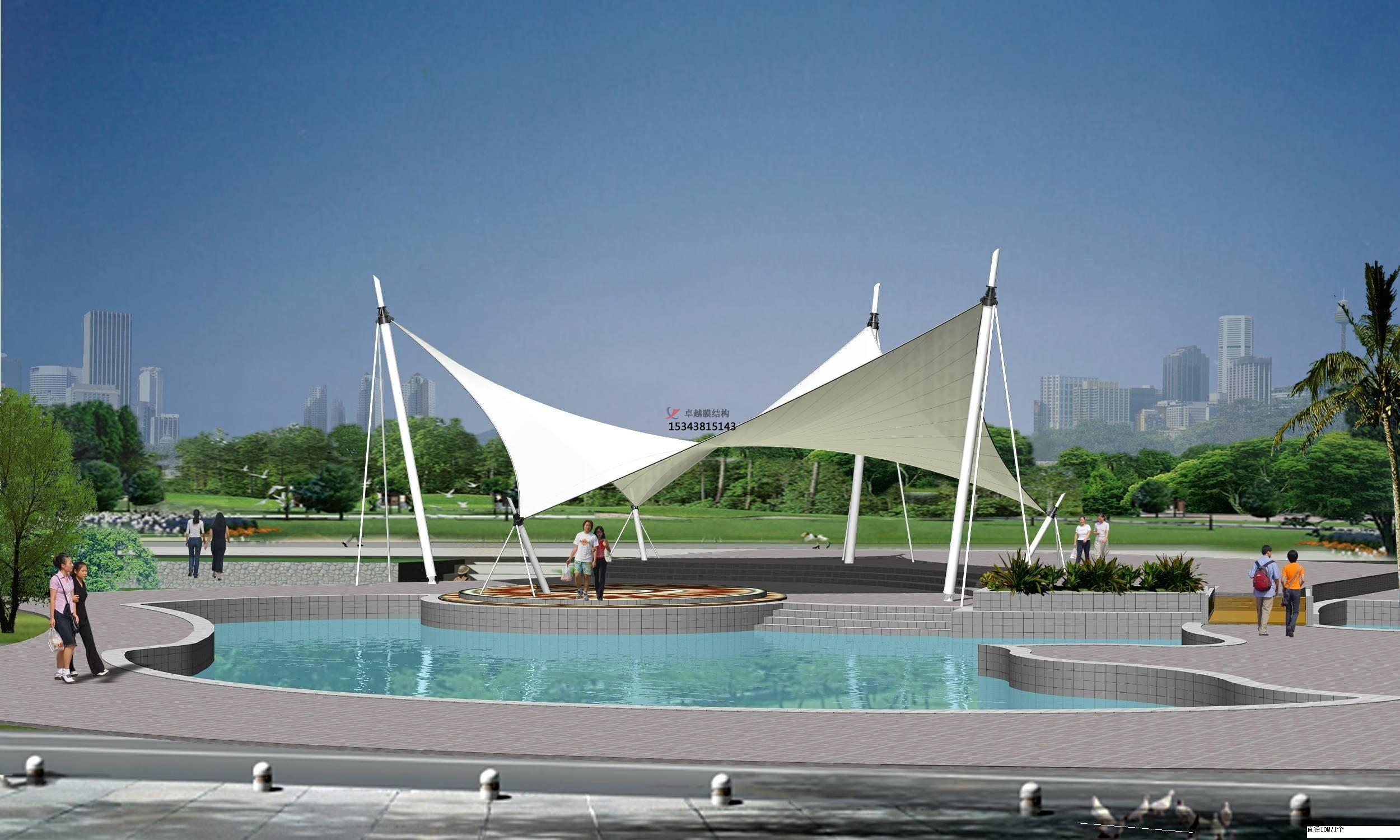 3、張拉膜景觀施工時間短,人工耗費相對少很多,天氣好耗材量也降低,整體膜結(jié)構(gòu)預(yù)算可以在保障工程質(zhì)量的前提下實惠不少。膜結(jié)構(gòu)是依靠膜自身的張拉應(yīng)力與支撐桿和拉索共同構(gòu)成機構(gòu)體系。通過改變形狀來分散荷載,從而獲得小內(nèi)力增長的,從而形成自由的曲面形態(tài)。