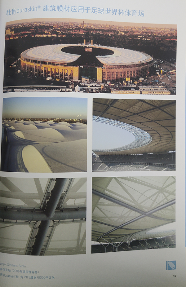 3、有眾多的成功案例:在歐洲的大型PVC項(xiàng)目幾乎都采用杜肯膜材:1993年斯圖加特體育場(chǎng)34000平方米;1994年德國(guó)Halle網(wǎng)球中心10000平方米;1995年奧地利機(jī)場(chǎng)停車(chē)場(chǎng)16000平方米;1996年土耳其安卡拉體育場(chǎng)16000平方米;德國(guó)科隆音樂(lè)中心25000平方米;1997年德國(guó)漢堡網(wǎng)球中心10000平方米;1998年法國(guó)圖盧茲體育場(chǎng)15000平方米;999年德國(guó)漢堡體育場(chǎng)50000平方米;2000年CARGOLIFTER車(chē)間110000平方米;2001年美國(guó)奧蘭多Dolphin賓館15000平方米等等。