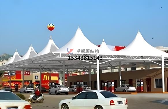 加油站張拉膜特點:造型美觀,透光性好,節(jié)能環(huán)保,抗震性強,施工便捷,經(jīng)濟性好。張拉膜結(jié)構(gòu)可通過獨特的曲面造型和豐富色彩,為加油站營造出現(xiàn)代、時尚的外觀,與周邊環(huán)境相融合,成為城市景觀的一部分。膜材具有較高的透光率,一般在 10%-20% 左右,部分可達 30% 以上,可提供自然采光,減少白天人工照明需求,節(jié)約能源。透光膜材可引入自然光減少照明能耗,結(jié)合自然通風(fēng)設(shè)計降低空調(diào)使用率,材料可回收性符合綠色建筑標(biāo)準(zhǔn),張拉膜具有良好的保溫隔熱性能,能有效降低加油站內(nèi)部能耗,配合節(jié)能照明設(shè)備,可實現(xiàn)綠色環(huán)保目標(biāo)。自重輕、柔性大,在風(fēng)荷載、雪荷載等外部荷載作用下,能通過變形分散荷載,具有良好的抗震性能,可抵抗 8 級地震。加油站膜結(jié)構(gòu)大部分構(gòu)件在工廠預(yù)制完成,現(xiàn)場組裝和安裝速度快,施工周期可比傳統(tǒng)建筑方式縮短一半以上,且對環(huán)境影響小,膜材料重量輕但強度高,降低支撐結(jié)構(gòu)負荷,安裝周期短,減少對加油站運營的影響。張拉膜結(jié)構(gòu)廣泛應(yīng)用于加油站頂棚設(shè)計,覆蓋加油區(qū)和洗車區(qū)域,為車輛及人員提供遮陽、防雨、防雪的全天候保護。在高速公路服務(wù)區(qū)、城市主干道等車流量密集區(qū)域,部分加油站結(jié)合張拉膜結(jié)構(gòu)擴展服務(wù)功能,例如設(shè)置司機休息區(qū)、戶外餐飲區(qū)或小型便利店,通過靈活的空間布局提升用戶體驗,其高效覆蓋能力尤為突出。雖然膜材和鋼結(jié)構(gòu)等材料成本相對較高,但由于施工周期短、維護成本低,長期來看綜合成本具有優(yōu)勢,且使用壽命可達 15-30 年甚至更長。