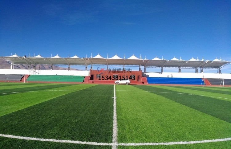 足球場看臺遮陽棚常見結(jié)構(gòu)形式:足球場看臺遮陽棚的形式也有很多,其中常見的有張拉膜結(jié)構(gòu)、骨架式膜結(jié)構(gòu)和充氣膜結(jié)構(gòu)。張拉膜結(jié)構(gòu)的原理是通過拉索或支撐結(jié)構(gòu)將膜材張拉成一定的形狀,利用膜材的張力來抵抗外荷載。這種結(jié)構(gòu)形式造型輕盈、美觀,具有良好的空間表現(xiàn)力,能夠為足球場增添獨(dú)特的景觀效果。同時,張拉膜結(jié)構(gòu)的施工速度快,可在較短的時間內(nèi)完成安裝。骨架式膜結(jié)構(gòu)的原理是以鋼骨架或鋁合金骨架為支撐,將膜材固定在骨架上形成遮陽棚。骨架式膜結(jié)構(gòu)的穩(wěn)定性好,能夠承受較大的荷載,適用于各種規(guī)模的足球場看臺。其骨架可以根據(jù)設(shè)計要求進(jìn)行多樣化的造型,與膜材相結(jié)合,營造出豐富的建筑外觀。充氣膜結(jié)構(gòu)的原理是利用空氣壓力使膜材膨脹形成一定的形狀,通過維持膜內(nèi)的氣壓來抵抗外荷載。充氣膜結(jié)構(gòu)的優(yōu)點(diǎn)是重量輕、施工速度快、成本較低,但其對氣密性要求較高,需要配備專門的充氣設(shè)備和控制系統(tǒng),以保證遮陽棚的正常使用。