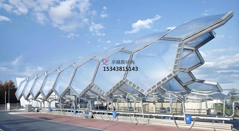 以下是膜結(jié)構(gòu)產(chǎn)品的主要應(yīng)用和特點:膜結(jié)構(gòu)自行車棚和機動車棚,膜結(jié)構(gòu)景觀,膜結(jié)構(gòu)污水池加蓋,膜結(jié)構(gòu)體育場館和展會建筑,膜結(jié)構(gòu)藝術(shù)裝置,膜結(jié)構(gòu)充電樁和收費站。膜結(jié)構(gòu)自行車棚采用輕質(zhì)且堅固的膜材料,具備優(yōu)異的抗風、抗雨雪能力,同時具有自潔性,減少維護成本。其優(yōu)雅的造型和多樣的色彩選擇,使其成為城市中的一道靚麗風景線,而機動車棚的篷布采用PVC、PVDF、PTFE、ETFE等材料,具有高強度、耐久性好、防火難燃、自潔性強等特點。其透光率為13%,熱能反射率為73%,能有效減少熱吸收,使用壽命可達15-30年4。膜結(jié)構(gòu)景觀是一種耐用、高強度的涂層織物,具有柔韌的質(zhì)地、重量輕、透光性極佳等特點,常被用于公園、廣場等場所,成為吸引眼球的藝術(shù)景觀。隨著工業(yè)污染的加劇,膜結(jié)構(gòu)污水池加蓋因其環(huán)保、施工簡便等優(yōu)勢,逐漸成為工業(yè)污水處理的首選。其鋼材料使用量少,能有效解決池體跨度過大的施工難題。膜結(jié)構(gòu)在體育場館和展會建筑中的應(yīng)用,不僅縮短了建設(shè)工期,降低了造價成本,還減少了環(huán)境污染。其大跨度的設(shè)計和高透光性,為場館提供了良好的采光和空間感。膜結(jié)構(gòu)藝術(shù)裝置設(shè)計簡單、造型獨特,不僅具有藝術(shù)展示效果,還能為人們提供休息場所,廣泛應(yīng)用于公園、景區(qū)等場所。膜結(jié)構(gòu)充電樁和收費站以其耐用性和美觀性,成為現(xiàn)代城市基礎(chǔ)設(shè)施的重要組成部分,為人們提供便捷服務(wù)的同時,也大大提升了城市形象。