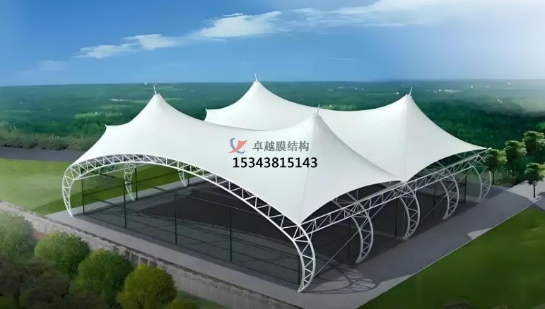 三 膜結(jié)構(gòu)雨棚的應(yīng)用領(lǐng)域:商業(yè)領(lǐng)域,交通領(lǐng)域,體育領(lǐng)域,景觀領(lǐng)域。商業(yè)領(lǐng)域,商場(chǎng)、購(gòu)物中心、商業(yè)街等的入口、廣場(chǎng)、停車(chē)場(chǎng)等位置,可提供遮陽(yáng)避雨的空間,同時(shí)增加空間利用率,其新穎的造型設(shè)計(jì)成為景觀亮點(diǎn)可吸引顧客,提升商業(yè)氛圍。交通領(lǐng)域,在機(jī)場(chǎng)、火車(chē)站的候車(chē)廳,高速公路服務(wù)區(qū)、收費(fèi)站、公交站臺(tái)等地方,能為旅客提供舒適的候車(chē)環(huán)境。體育領(lǐng)域,大型體育館以及體育看臺(tái)常采用膜結(jié)構(gòu)雨棚,其大跨度特性可滿足視野寬闊無(wú)結(jié)構(gòu)遮擋的要求,且膜材透光性可使白天室內(nèi)達(dá)到和室外幾乎一樣的自然效果,體育館、體育場(chǎng)、游泳館等體育場(chǎng)館的入口、看臺(tái)、休息區(qū)等,可保護(hù)觀眾和運(yùn)動(dòng)員免受風(fēng)雨侵襲,增強(qiáng)場(chǎng)館的整體美觀度。景觀領(lǐng)域,公園、廣場(chǎng)、花園、景區(qū)等地方,作為景觀小品或休息設(shè)施,為人們提供休息、觀賞的空間,與自然環(huán)境相融合,增添景觀的現(xiàn)代感,膜結(jié)構(gòu)雨棚與周?chē)h(huán)境融為一體可創(chuàng)造出浪漫溫馨的空間,在夜間彩燈映射下形成絢麗繽紛的景觀。工業(yè)領(lǐng)域,膜結(jié)構(gòu)廠房具有結(jié)構(gòu)輕便、抗震性好等特點(diǎn),廣泛應(yīng)用于各類(lèi)工廠,也可用于一些倉(cāng)庫(kù)、污水處理設(shè)施等的覆蓋。