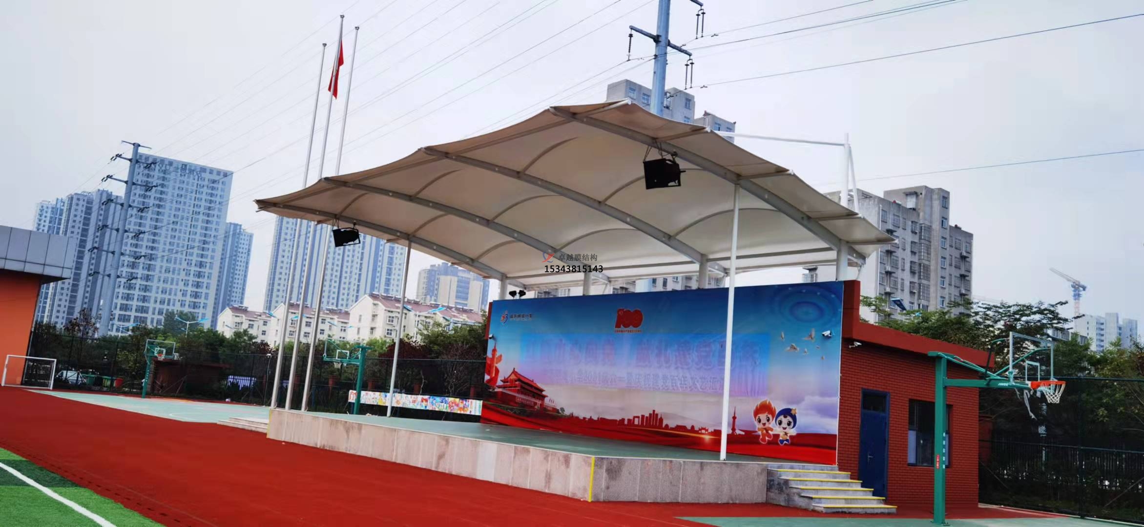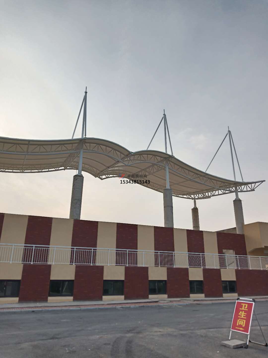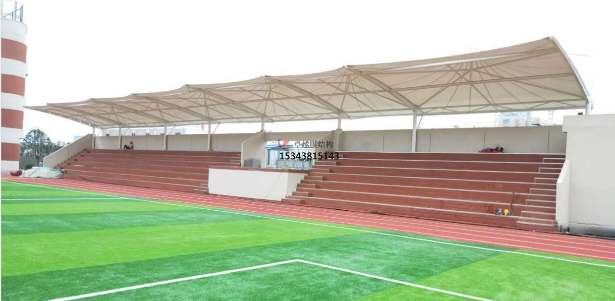 膜結構看臺在體育設施上主要應用在學校操場運動看臺或主席臺屋頂,另外大型體育場館看臺膜結構屋頂也屢見不鮮??磁_造型般由貝殼形峰膜及部張拉膜組成,形式新穎活潑。膜結構看臺將鋼架、索、膜巧妙結合,通過薄膜、膜邊索、脊索、谷索、拉索、拉桿及定的格構梁來穩(wěn)定。膜頂平滑過渡,結構美觀、輕巧、整體造型相互輝映,別具格。