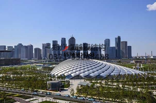 膜結(jié)構(gòu)是一種建筑與結(jié)構(gòu)完美結(jié)合的結(jié)構(gòu)體系。它是用高強度柔性薄膜材料與支撐體系相結(jié)合形成具有一定剛度的穩(wěn)定曲面,能承受一定外荷載的空間結(jié)構(gòu)形式。其造型自由輕巧、阻燃、制作簡易、安裝快捷、節(jié)能、安全等優(yōu)點,因而使它在世界各地受到廣泛應(yīng)用。這種結(jié)構(gòu)形式特別適用于大型體育場館、入口廊道、小品、公眾休閑娛樂廣場、展覽會場、購物中心等領(lǐng)域。