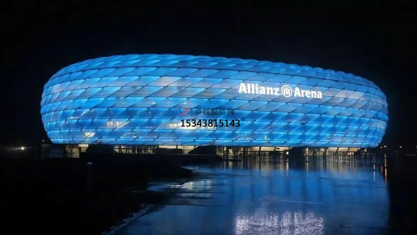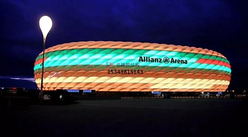 安聯(lián)球場(chǎng)的外墻由許多個(gè)ETFE氣枕構(gòu)成,內(nèi)嵌發(fā)光系統(tǒng),超過(guò)三十萬(wàn)個(gè)LED燈可在夜晚組成1600 萬(wàn)種顏色圖形。它是世界上最早能實(shí)現(xiàn)變色的球場(chǎng)。由于每個(gè)表皮構(gòu)建有34度的斜角,即使身處最高層看臺(tái)也能提供同樣棒的視覺效果。