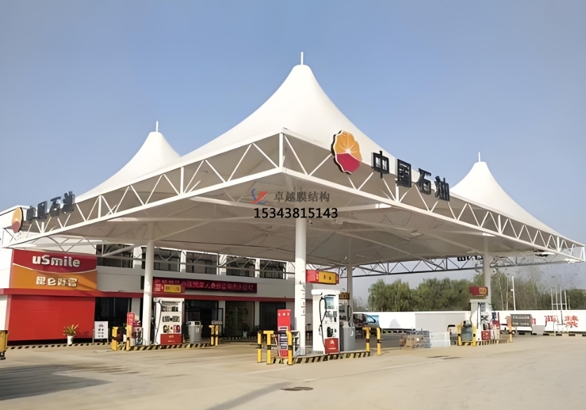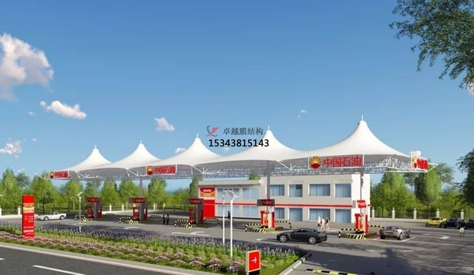 美觀與個性化:膜結(jié)構(gòu)頂棚設(shè)計靈活多樣,可根據(jù)加油站的整體風格與周邊環(huán)境,定制各種獨特的形狀和顏色。無論是流暢的曲線造型,還是富有現(xiàn)代感的幾何形狀,都能為加油站增添獨特魅力,提升其整體美觀度與辨識度,成為城市道路上一道亮麗的風景線。