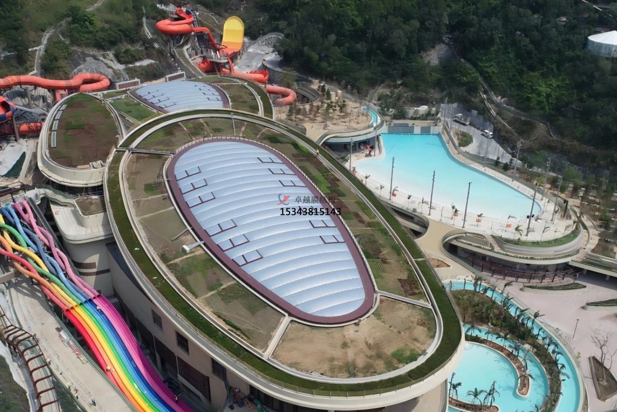輕盈透明的膜材如同巨大的泡泡,溫柔包裹水上樂園的一角。不僅有效阻擋紫外線,還能通過膜材的透光性,讓自然光柔和灑落,營造出夢幻般的氛圍。孩子們在泡泡下嬉戲,仿佛置身于童話世界,安全又有趣。