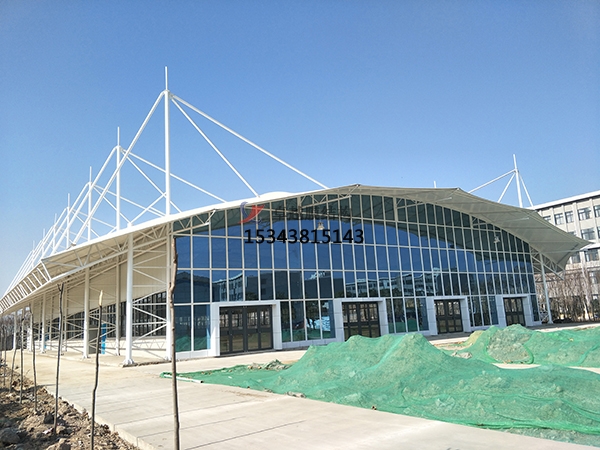 場(chǎng)館看臺(tái)膜結(jié)構(gòu)特點(diǎn):其具有造型美觀、施工簡(jiǎn)便、透光性好、自潔性強(qiáng)、節(jié)能環(huán)保、適應(yīng)性強(qiáng)等特點(diǎn)。膜材料具有優(yōu)異的柔韌性和可塑性,能夠創(chuàng)造出豐富多彩的建筑造型,如貝殼形、弧形、錐形等,為場(chǎng)館增添獨(dú)特的藝術(shù)氛圍。膜結(jié)構(gòu)看臺(tái)的施工過程相對(duì)簡(jiǎn)單,不需要大型機(jī)械設(shè)備和腳手架等輔助工具。裁剪、拼接和安裝都可以在加工廠完成,現(xiàn)場(chǎng)只需進(jìn)行簡(jiǎn)單的張拉和錨固,可有效縮短施工周期。膜材具有良好的透光性,白天陽光可以透過膜材形成漫射光,使膜覆蓋空間內(nèi)達(dá)到和室外幾乎一樣的自然效果,不僅能為觀眾提供舒適的觀賽環(huán)境,還能節(jié)省大量的照明能源。膜材表面光滑,灰塵、污垢等不易附著,在雨水的沖刷下可恢復(fù)其原有的清潔面層與透光性,大大減少了后期的清潔維護(hù)工作量。膜材料本身具有一定的隔熱性能,能有效阻擋太陽輻射熱傳入室內(nèi),降低場(chǎng)館的空調(diào)能耗。同時(shí),其可回收再利用的特性也符合綠色環(huán)保的建筑理念。膜結(jié)構(gòu)看臺(tái)的設(shè)計(jì)可以根據(jù)不同的需求和場(chǎng)景進(jìn)行定制,適應(yīng)各種地形和環(huán)境,如山地、水域和不規(guī)則地形等。