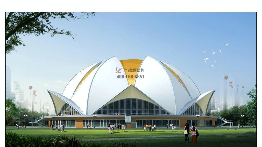 膜結(jié)構(gòu)突破了傳統(tǒng)的建筑結(jié)構(gòu)形式,具有造型優(yōu)美、飄逸自然、融藝術(shù)、力學(xué)于一體,可充分發(fā)揮建筑師的想象力,建造成各種造型,且色彩豐富,膜結(jié)構(gòu)被譽為21世紀的現(xiàn)代高科技綠色建筑。?