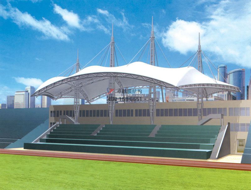 膜結(jié)構(gòu)看臺(tái)在體育設(shè)施上主要應(yīng)用在學(xué)校操場(chǎng)運(yùn)動(dòng)看臺(tái)或主席臺(tái)屋頂,另外大型體育場(chǎng)館看臺(tái)膜結(jié)構(gòu)屋頂也屢見不鮮??磁_(tái)造型般由貝殼形峰膜及部張拉膜組成,形式新穎活潑。膜結(jié)構(gòu)看臺(tái)將鋼架、索、膜巧妙結(jié)合,通過薄膜、膜邊索、脊索、谷索、拉索、拉桿及定的格構(gòu)梁來穩(wěn)定。膜頂平滑過渡,結(jié)構(gòu)美觀、輕巧、整體造型相互輝映,別具格,接下來我們起來看看膜結(jié)構(gòu)看臺(tái)的設(shè)計(jì)是怎么樣的。
