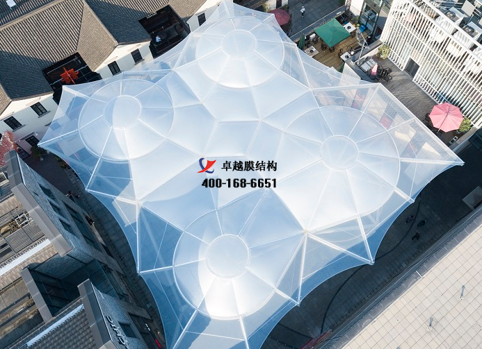 工程特點(diǎn):該項(xiàng)目是國(guó)內(nèi)好的單層ETFE加雙層氣枕膜完美嵌合的景觀雨棚建筑,利用ETFE膜材的高透光高自潔性以及雙層氣枕的隔熱能力,雨棚在具有遮陽(yáng)擋雨功能的同時(shí)還可以實(shí)現(xiàn)自然采光,行人沒有傳統(tǒng)密封建筑的束縛感;另一方面,ETFE膜結(jié)構(gòu)建筑是當(dāng)代更新的建筑應(yīng)用形式之一,工程高度定制,顏值高,具有好的性,天生自帶聚集人氣光環(huán)。