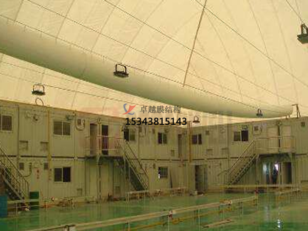 充氣膜封閉煤場工程中,所有加工工作均在工廠內(nèi)完成,在現(xiàn)場中進行安裝作業(yè)。從設(shè)計、設(shè)備采購到加工,兩個月內(nèi)能夠完成,運抵現(xiàn)場后,一般只需10天就可將主題建筑安裝完畢!