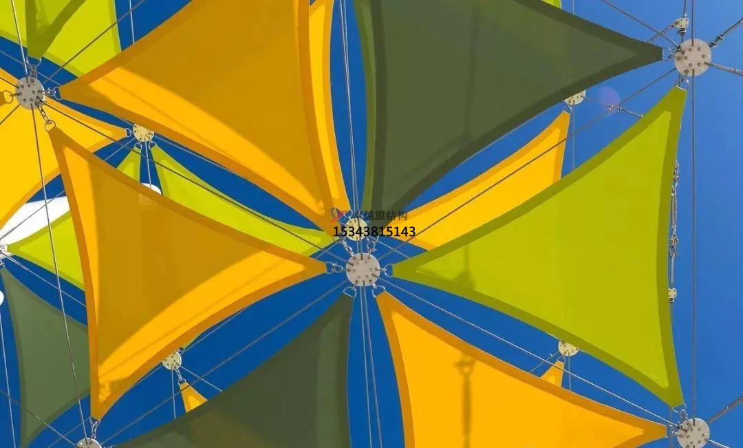 381網(wǎng)孔膜開孔度為4%,具有很好的遮陽(yáng)透氣功效。Soltis92織物織就的明黃,明綠及暗綠的三角遮陽(yáng)帆層層疊疊,在自然光及夜景燈光下非常好看。