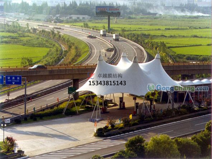 4.膜結(jié)構(gòu)跨度大:膜結(jié)構(gòu)可建成無中間支撐柱的大跨度建筑,一些大型公眾活動(dòng)場所,收費(fèi)站館,要求室內(nèi)形成無立柱,大面積的開闊空間,這種建筑形式特別適合采用膜結(jié)構(gòu)的屋頂。因?yàn)閱挝幻娣e的膜很輕,大大減輕了骨架的承重。