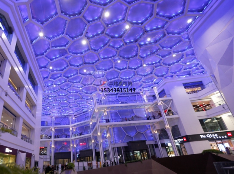 特點:商業(yè)街膜結(jié)構(gòu)穹頂天幕特點:透光性好、材質(zhì)輕、適合大跨度,可以完美取代傳統(tǒng)的穹頂材料,而且使用壽命更長、自潔性更佳、安全性更高。