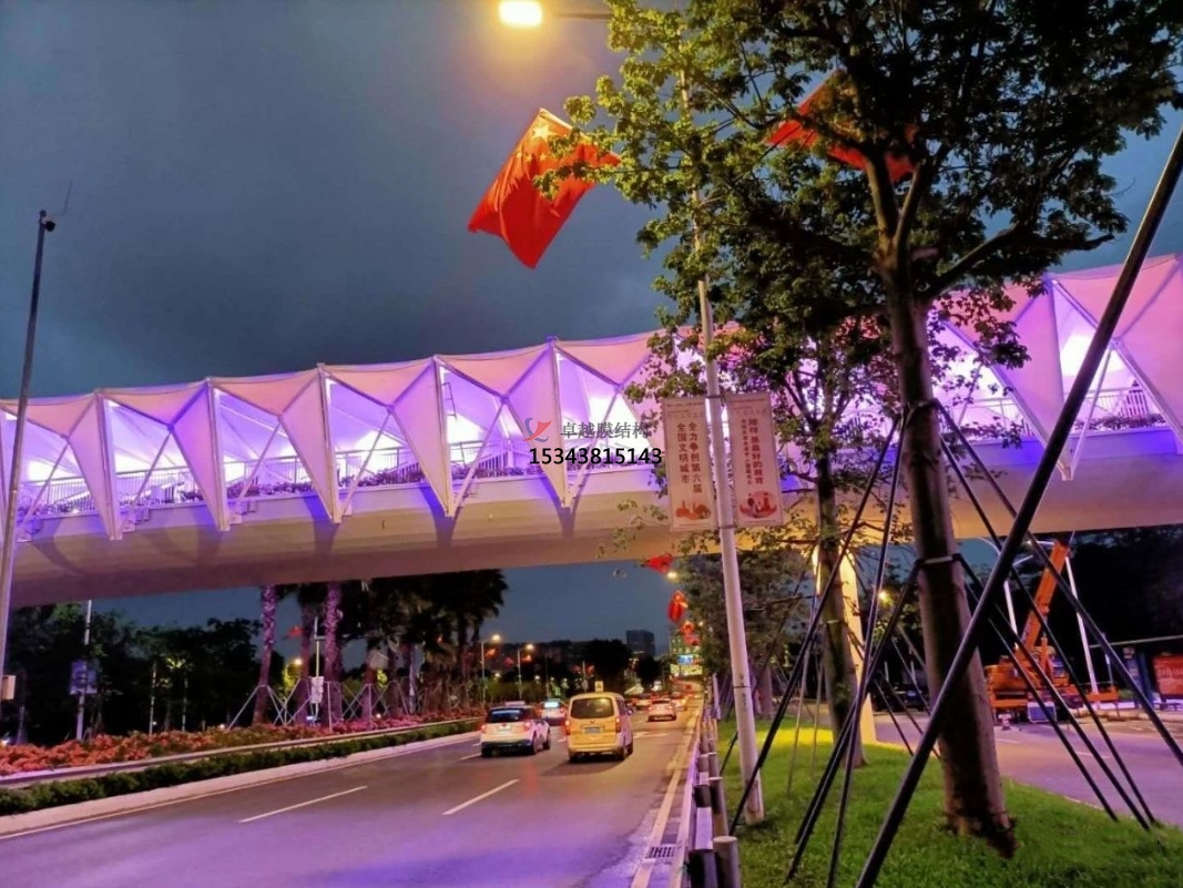 為了保質(zhì)、保量、保證工期、保安全的情況下順利的把項目交到業(yè)主手中,把施工人員分成兩班晝夜不分,日夜加班,還要克服現(xiàn)場的高溫,施工節(jié)點的困難,而且每片膜材的尺寸也不相同,為了膜材裁剪精準(zhǔn),設(shè)計師每跨每跨的量尺寸,又復(fù)合尺寸,確保了天橋立面膜結(jié)構(gòu)的安裝工程順利進(jìn)行。