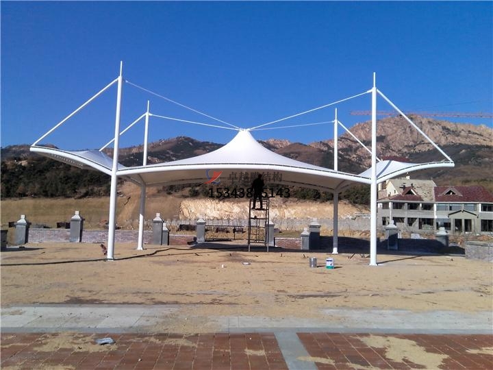 因為景觀膜結構遮陽棚是由多種高強薄膜資料及加強構件經(jīng)過必定方法使其內部發(fā)生必定的預張應力以構成某種空間形狀,作為掩蓋結構,并能接受必定的外荷載效果的一種空間結構方式。