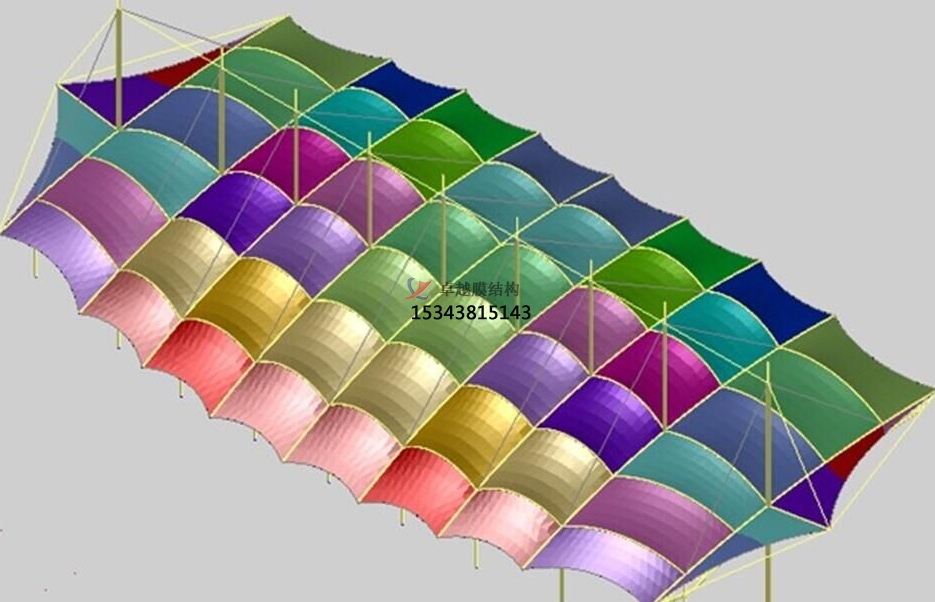 索膜結(jié)構(gòu)和膜結(jié)構(gòu)的核心構(gòu)成:索膜解構(gòu)是由索網(wǎng)系統(tǒng)和膜材構(gòu)成的,膜結(jié)構(gòu)是由膜材和支撐體系構(gòu)成。在索膜解構(gòu)中,索網(wǎng)系統(tǒng)承擔(dān)主要的拉力,通過(guò)張拉形成穩(wěn)定的幾何形狀(如馬鞍形、傘形等),是結(jié)構(gòu)的 “骨架”,由膜材覆蓋在索網(wǎng)上,除了承受自身荷載外,還與索網(wǎng)共同抵抗外部荷載(如風(fēng)、雪)。索網(wǎng)的存在使結(jié)構(gòu)剛度更高,可跨越更大跨度,形態(tài)更靈活,常用于需要復(fù)雜曲面或大空間的場(chǎng)景。在膜結(jié)構(gòu)中,膜材是主要材料,多為高分子復(fù)合材料(如PVDF膜、PTFE膜),依賴自身張力或外部支撐保持形態(tài)。支撐體系包括骨架(如鋼結(jié)構(gòu)、鋁合金框架)、桅桿、拉索等,但膜材是受力主體。特點(diǎn)能更強(qiáng)調(diào)膜材的獨(dú)立性,支撐體系相對(duì)簡(jiǎn)單,結(jié)構(gòu)形式更輕量化,適用于中小型跨度或?qū)υ煨陀刑厥庖蟮膱?chǎng)景。