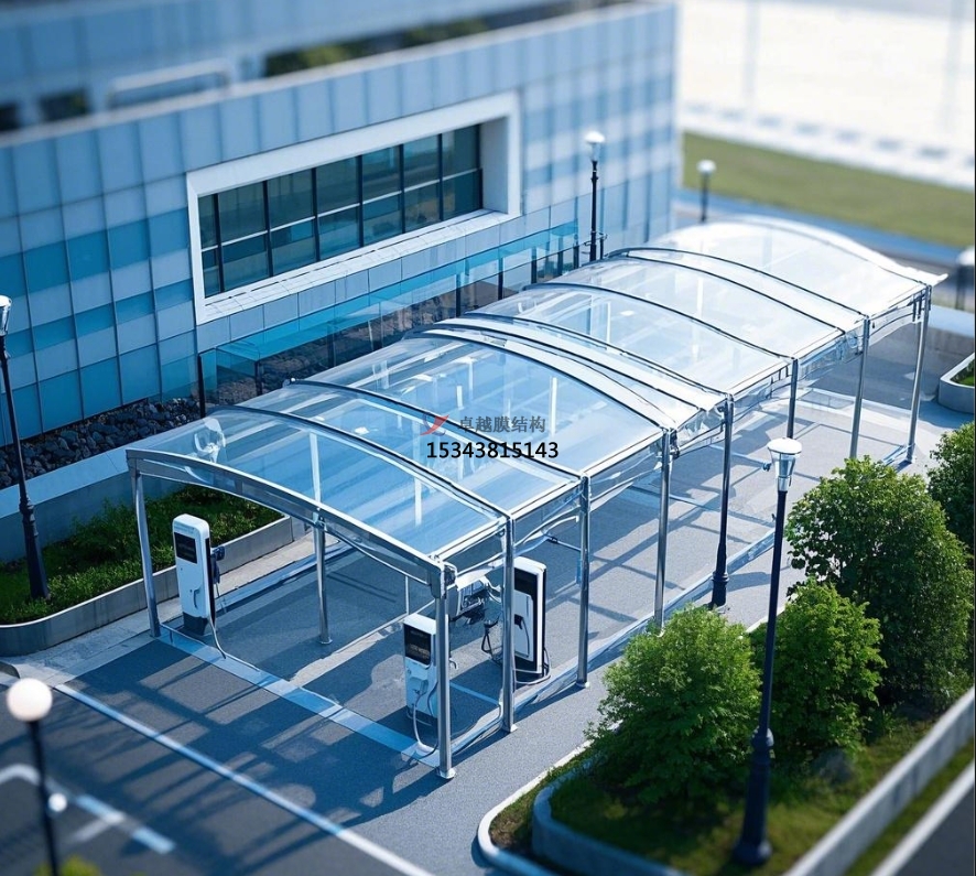 ??????? 膜結(jié)構(gòu)罩棚以其流暢的曲線、共同的造型,為充電站增添了異樣的美學(xué)魅力。它打破了傳統(tǒng)修建的刻板印象,展現(xiàn)出輕盈、靈動(dòng)的現(xiàn)代風(fēng)格。膜材的色彩豐富多樣,可根據(jù)充電站全體規(guī)劃風(fēng)格與周邊環(huán)境進(jìn)行挑選搭配,或是挑選新鮮明快的色彩,營造舒適迷人的氣氛;或是與周邊修建色彩相呼應(yīng),融入城市景觀。比方,位于城市公園附近的充電站,選用綠色彩的膜結(jié)構(gòu)罩棚,與公園的天然環(huán)境相輔相成,成為城市中的一道亮麗風(fēng)景線,提升了城市形象。