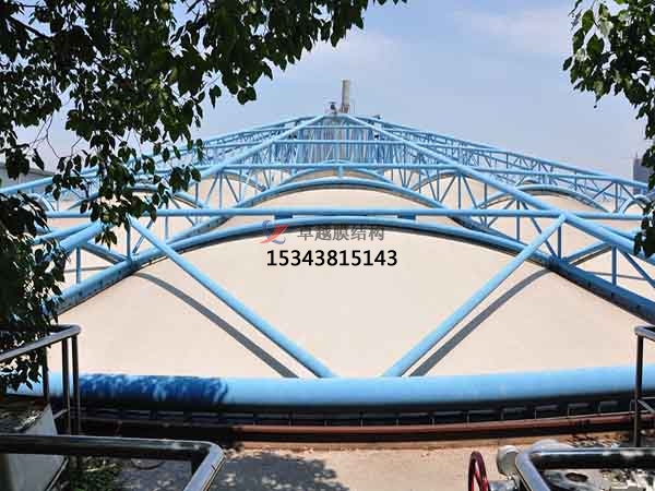 2、我公司利用膜結(jié)構(gòu)的輕巧,別致的造型建造各種半封閉,全封閉的不行空間;污水池反吊膜結(jié)構(gòu)中的高強(qiáng)度柔韌薄膜稱膜材,它是一種耐腐蝕、耐高溫、耐久用、高強(qiáng)度的樹脂類涂層織物,由多種復(fù)合PVC樹脂涂層刀刮成型,具有質(zhì)地柔韌、厚度小、重量輕、透光性好的特點(diǎn)。對(duì)自然光吸收和透射能力、阻燃,具有良好的耐久、防火、氣密等特性;表面經(jīng)過特氟龍?zhí)幚砘蚨趸伩估匣幚?,具有較高的自清潔性能。下面就大家介紹一下我公司在泰安市地區(qū)完成的部分污水池膜結(jié)構(gòu)封閉項(xiàng)目。