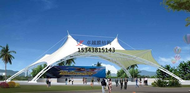 用于張拉膜景觀中的高強度柔韌薄膜稱膜材,它是一種耐久用、高強度的涂層織物,由織物和涂層復合而成,具有質地柔韌、厚度小、重量輕、透光性好的特點。對自然光吸收和透射能力、阻燃,具有良好的耐久、防火、氣密等特性;