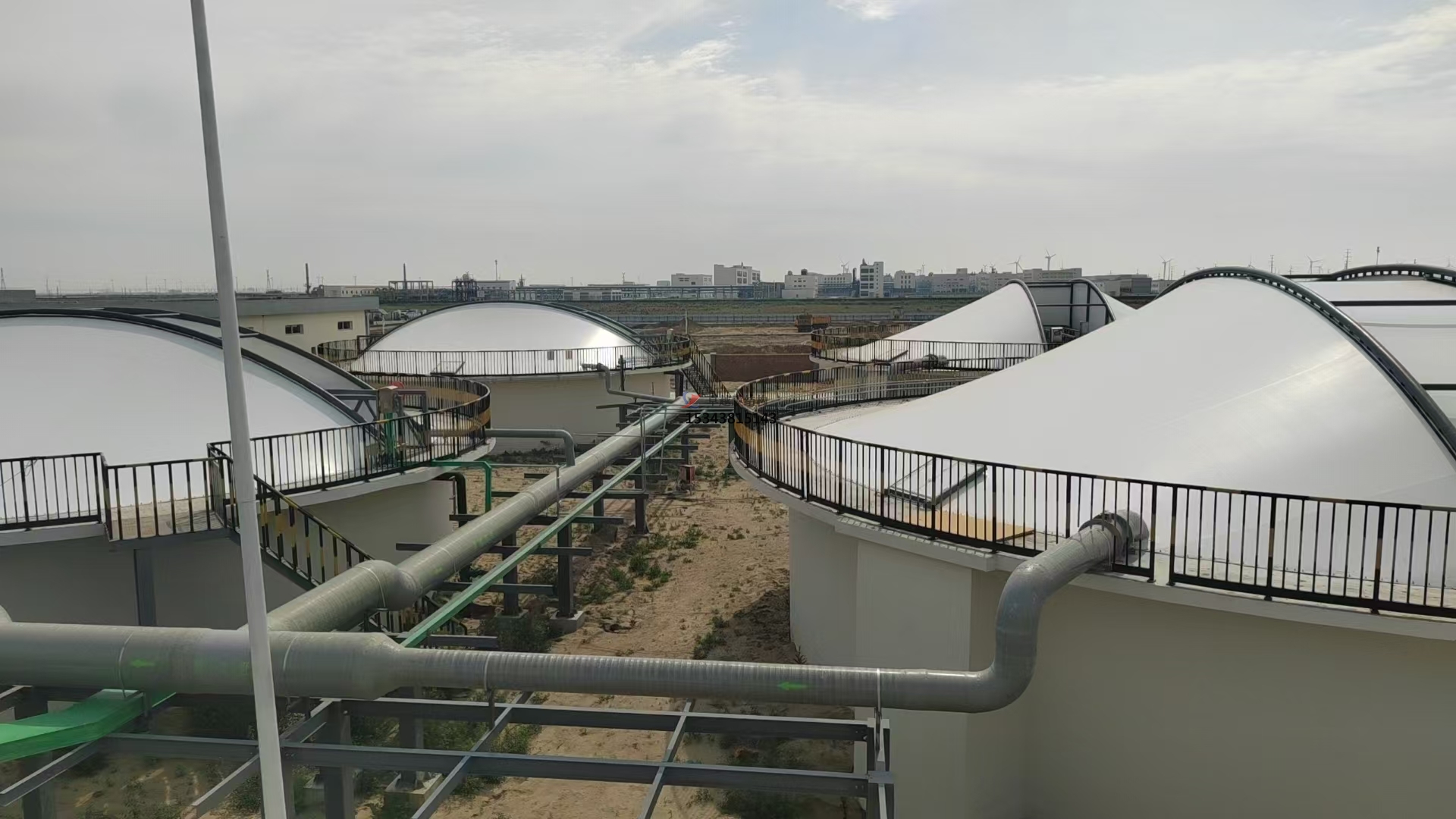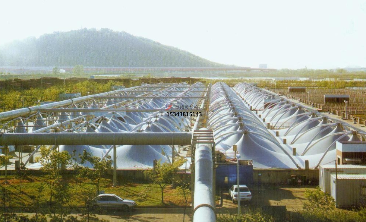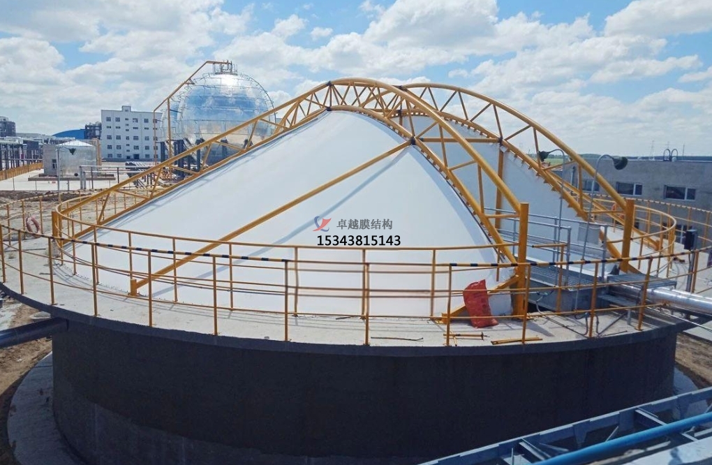 污水池反吊膜,顧名思義,是一種將薄膜材料以反吊的方式覆蓋在污水池上方的結(jié)構(gòu)。這種結(jié)構(gòu)通過鋼架或索網(wǎng)等支撐體系,將膜材料緊繃并固定于污水池上方,形成一個密閉或半密閉的空間,有效隔絕污水池內(nèi)的惡臭氣體和有害物質(zhì),防止其對外擴散,同時保護膜材料免受污水池內(nèi)腐蝕性氣體的侵蝕。