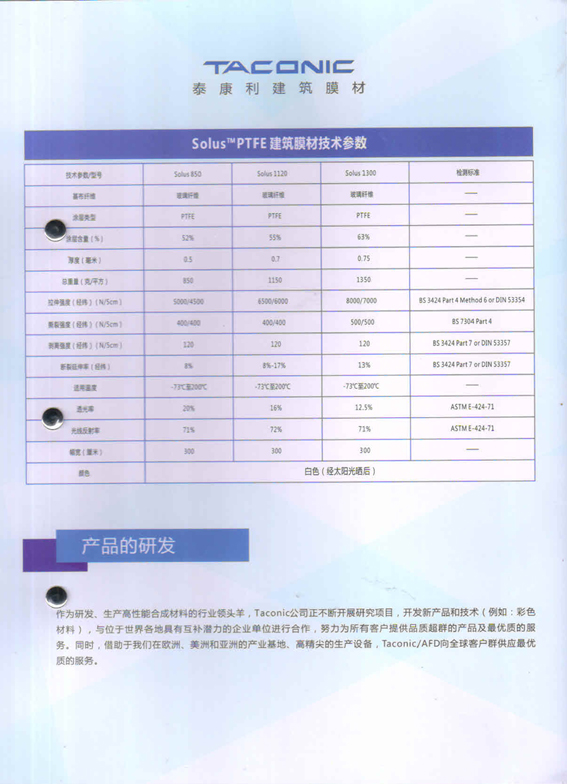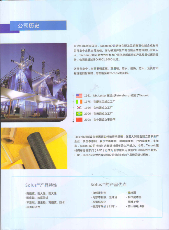 十多年來,Taconic公司持續(xù)地?cái)U(kuò) 大了其建材織布的生產(chǎn)能力。今天,Taconic的建 材織布分支部門](AFD)已成為全球建筑用級(jí)別PTFE /織布的主要生產(chǎn)廠家,Taconic向全世界織布結(jié)構(gòu)公司供應(yīng)Solus 品牌的建材織布。借助于我們?cè)跉W洲,美洲和亞洲的產(chǎn)業(yè)基地,Taconic/AFD 通過其分布各地的加工,銷售和服務(wù)網(wǎng)絡(luò)向全球客戶群供應(yīng)優(yōu)質(zhì)服務(wù)。